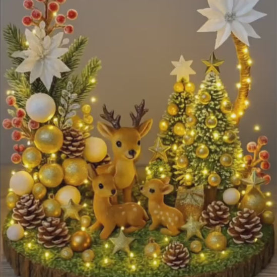Au cœur de la scène, trois petits rennes se tiennent dans une forêt miniature scintillante, entourés de sapins décorés, pommes de pin givrées, étoiles et boules dorées.